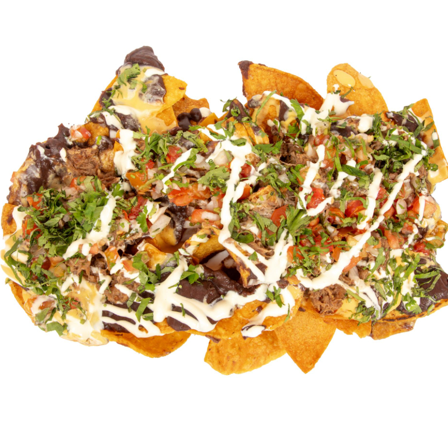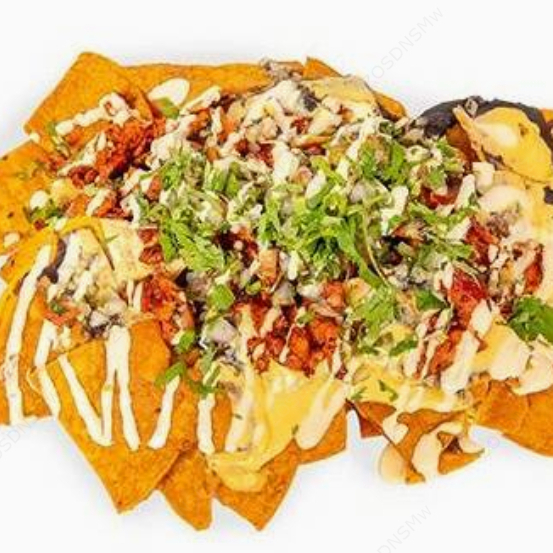 Deliciosos totopos (tortilla de maíz) con frijoles, queso cheddar, pico de gallo y natilla, ¡agrégale bistec, birria, pollo o pastor!