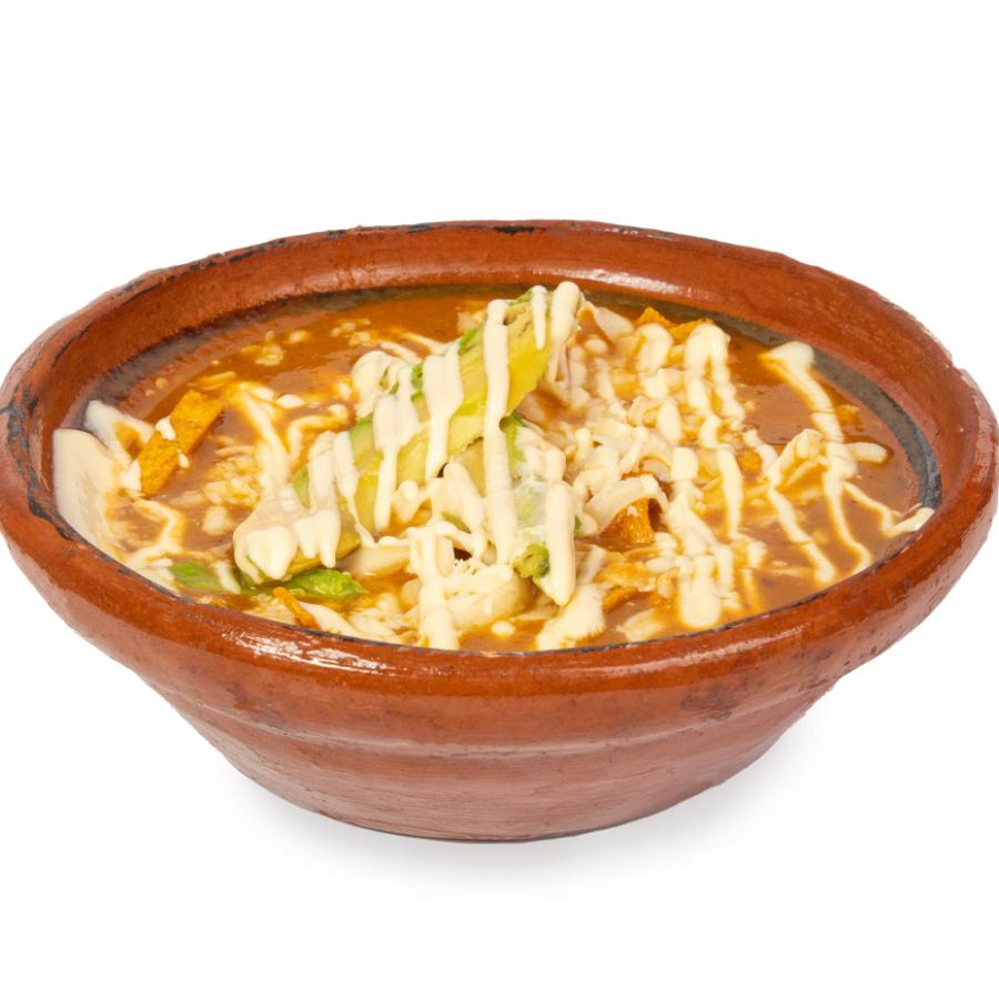 ¡La infaltable sopa azteca! Acompáñala con queso rallado, natilla, tortillitas, y aguacate.