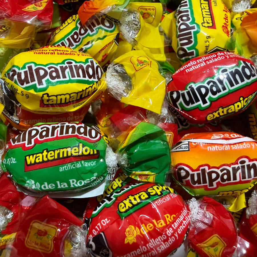 Caramelo relleno de tamarindo natural salado y enchilado, sabores surtidos; original, mango, sandía y extra picante