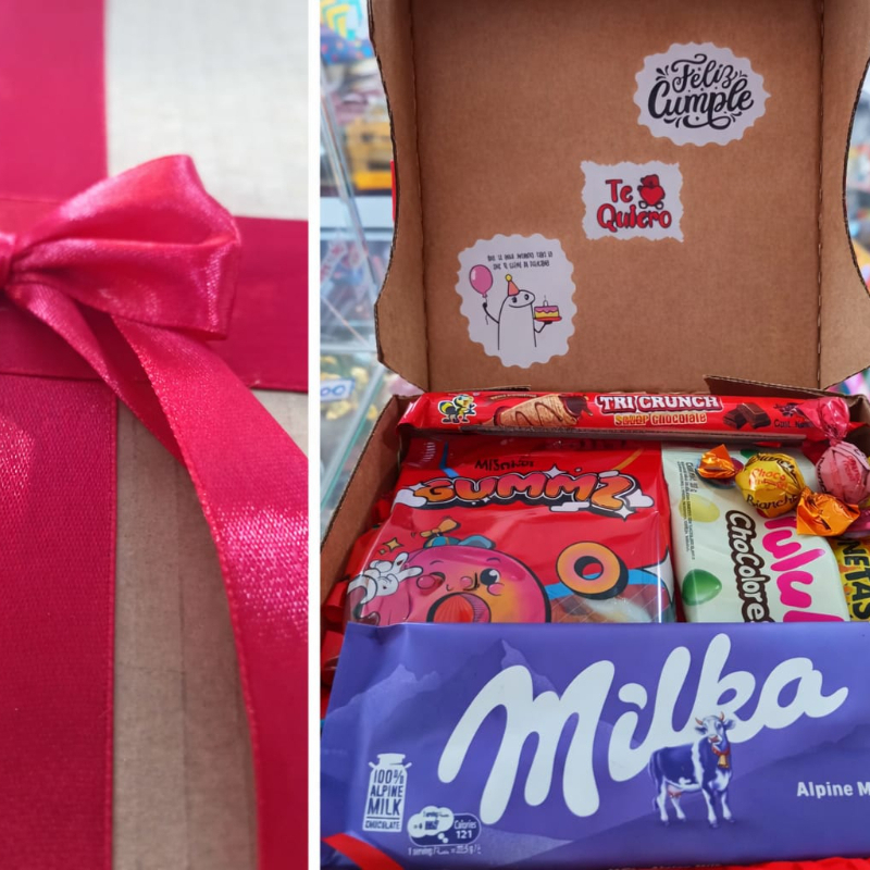 Cajita rellena con golosinas (chocolate milka, gomitas trululu,chocolores,botonetas,barquillo,choco bon bon) con msj para cumpleaños