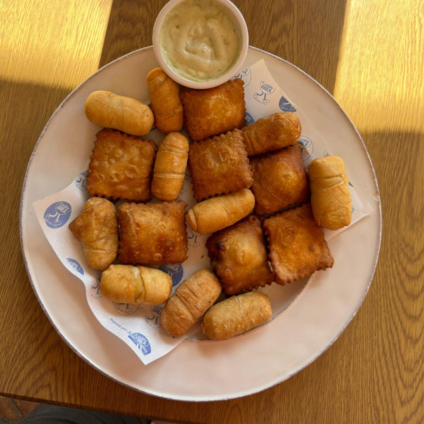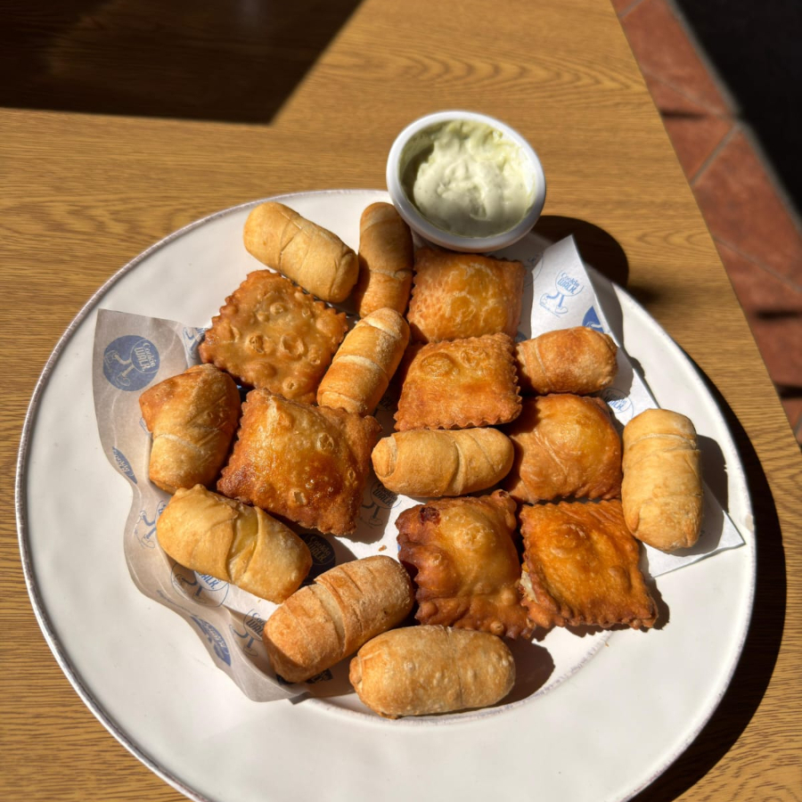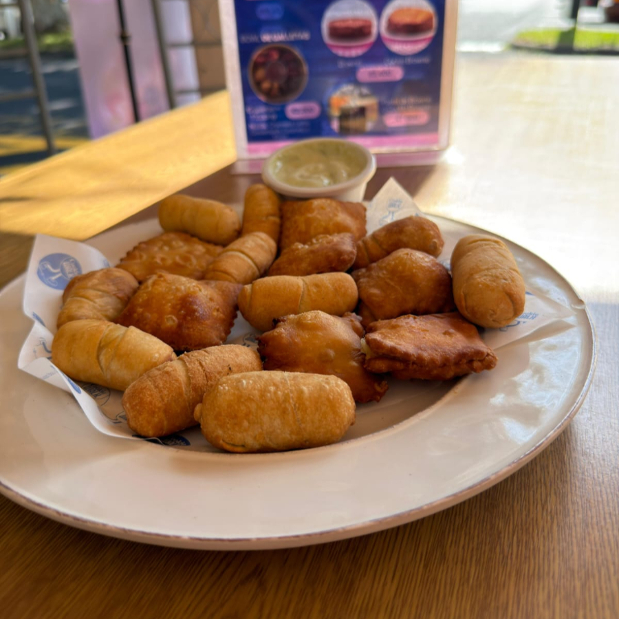 Box de 10 mini tequeños y 10 Mini pastelitos con salsa de la casa