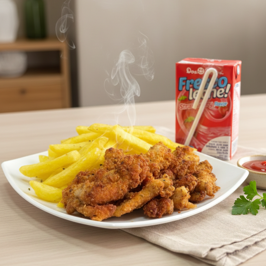 Palomitas de pollo frito con papas y fresco leche sabor a disponibilidad