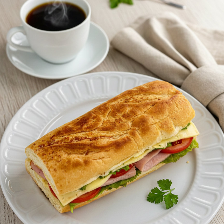 Sandwich de queso, Jamon y salsa de tomate y mayonesa y salsa de especie, acompañado de café