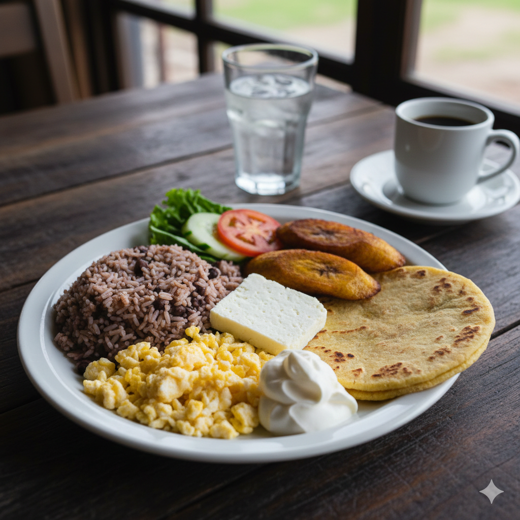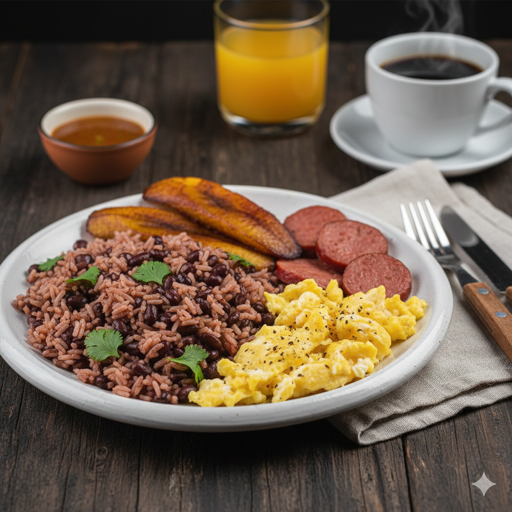 Pinto , queso de derretido , huevo,maduro, acompañado de café negro