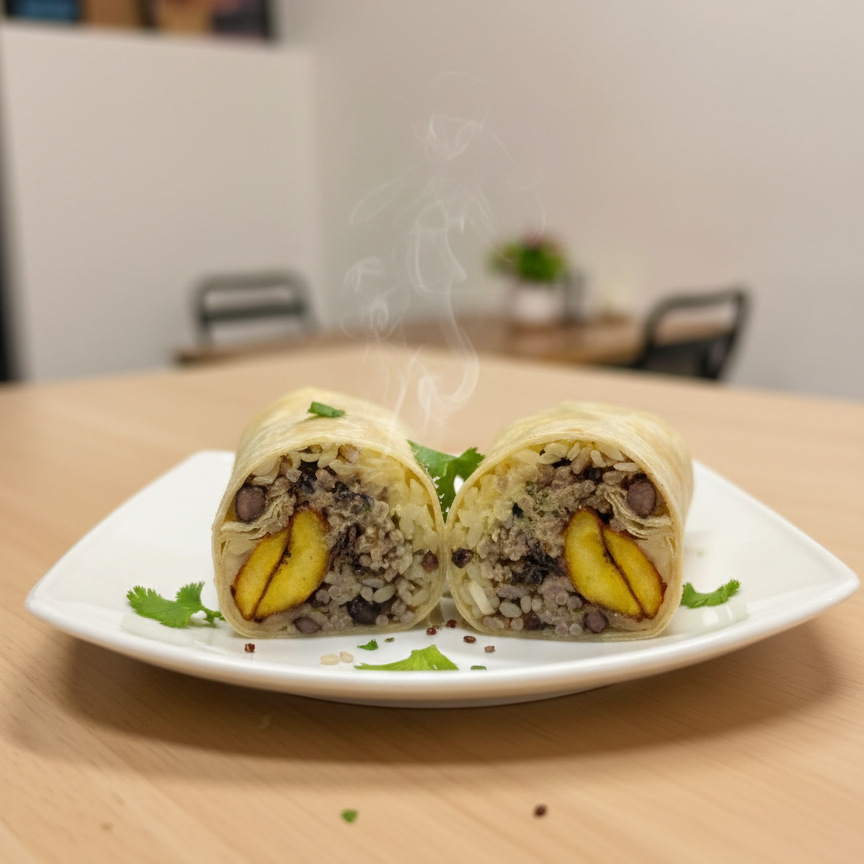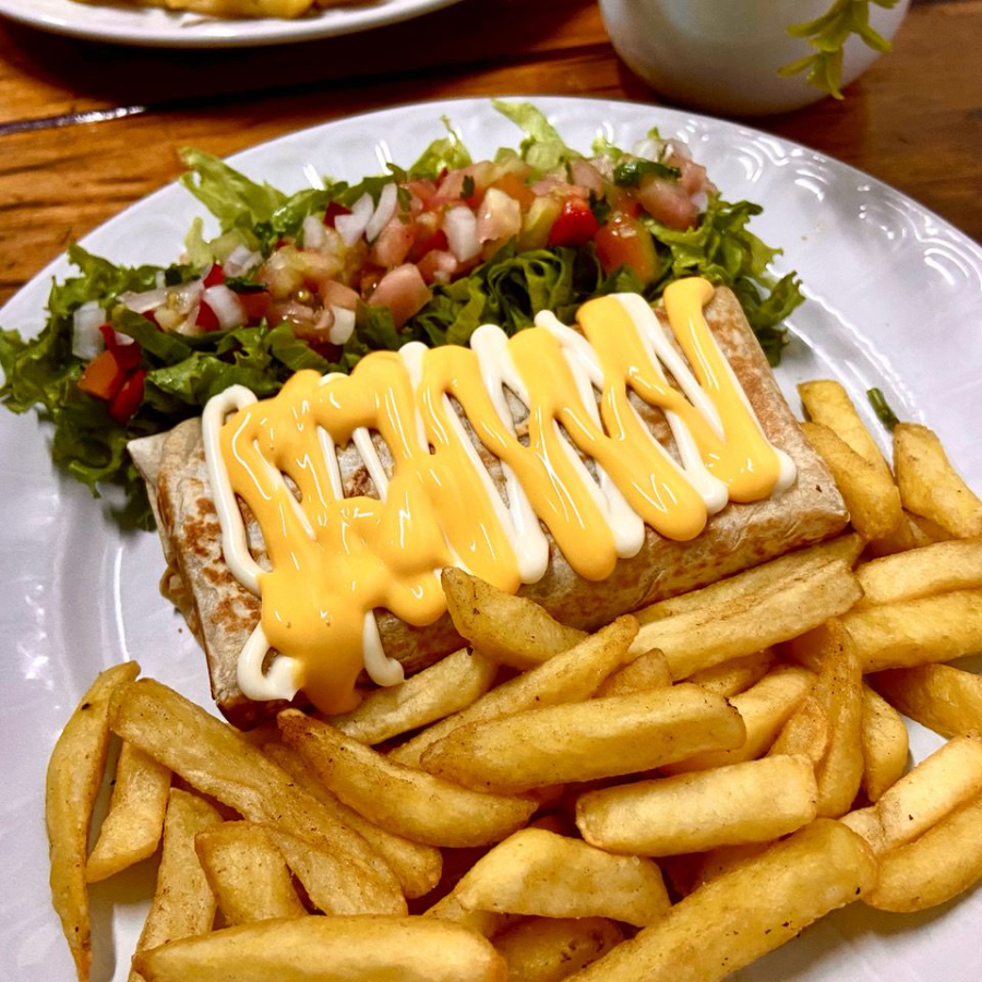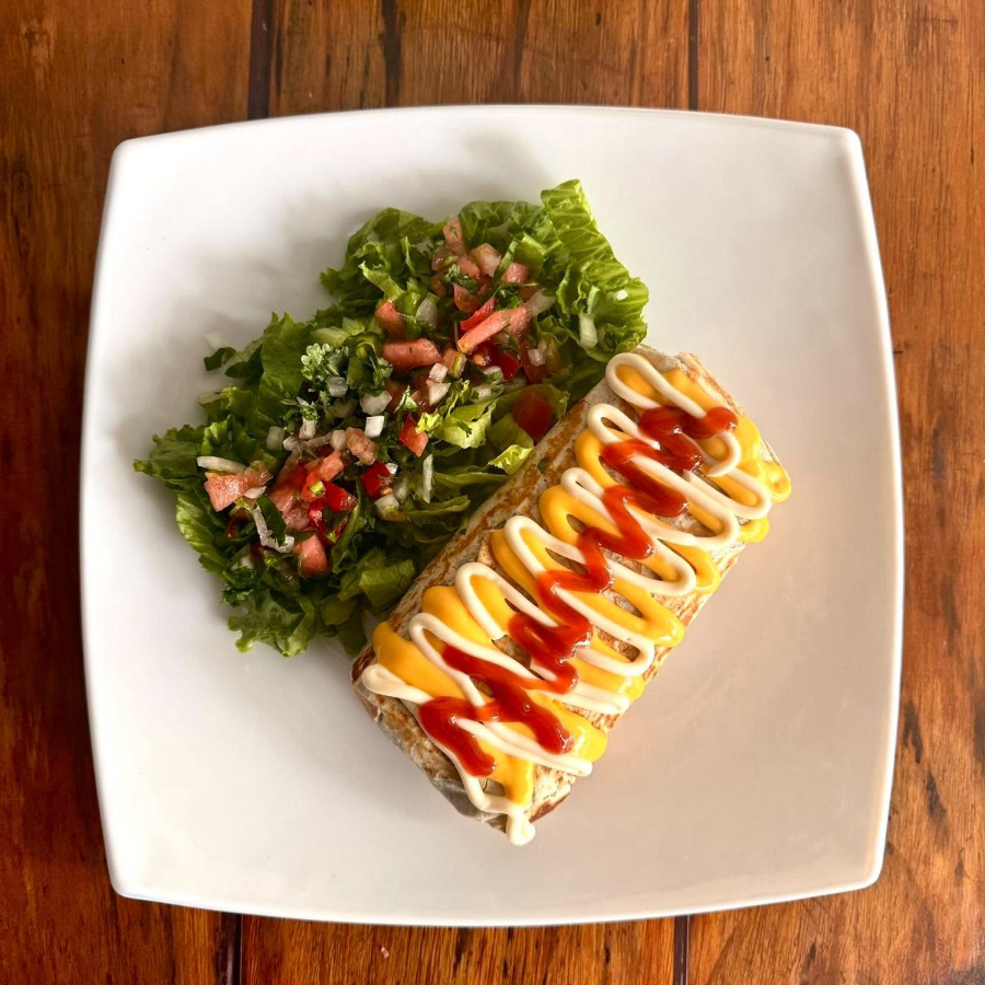 burrito relleno de carne, queso de derretido, lechuga, tomate, salsas