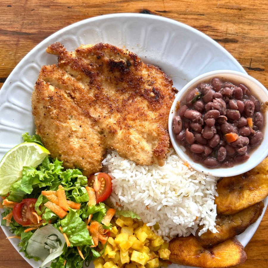 Arroz, frijoles,picadillo, ensalada verde, plátanos maduros, fresco natural