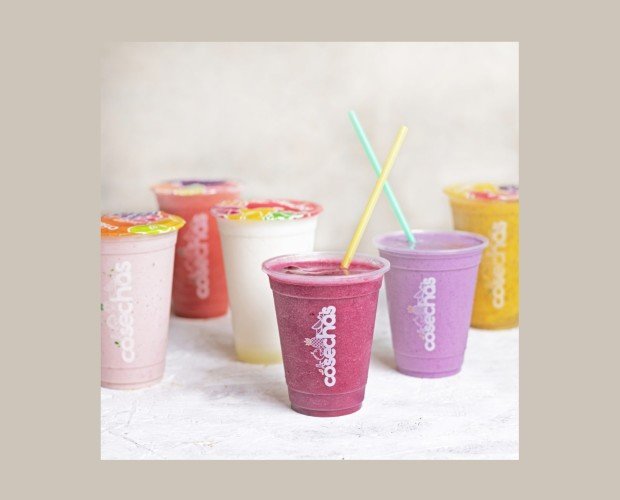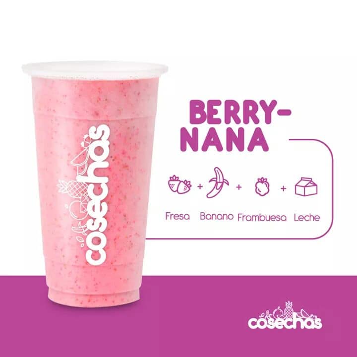 En leche, fresa, banano y frambuesa.