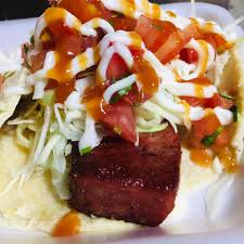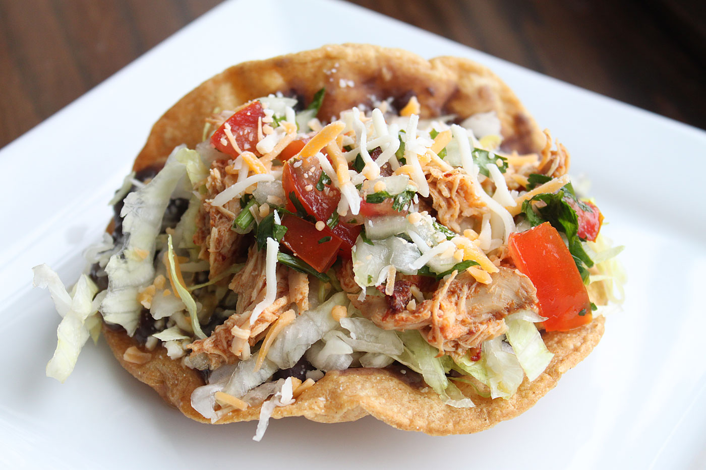 Arroz, frijoles, carne de cerdo, pico de gallo, aguacate, picozón con panameño, jalapeños en mitades y tortillitas fritas.