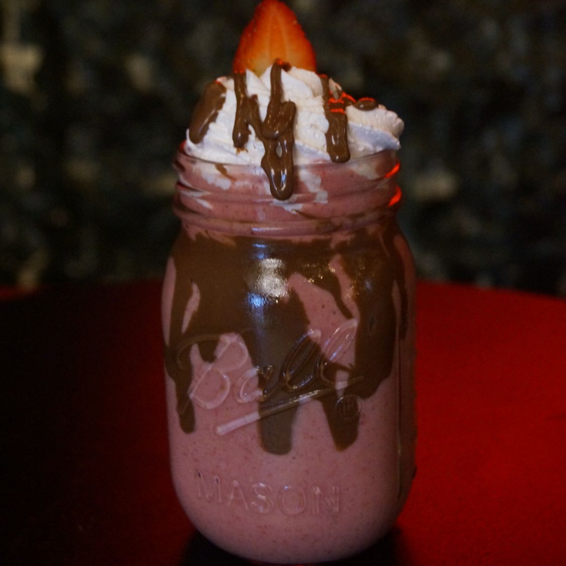 Leche, hielo frappé, chantilly, nutella , fresa.