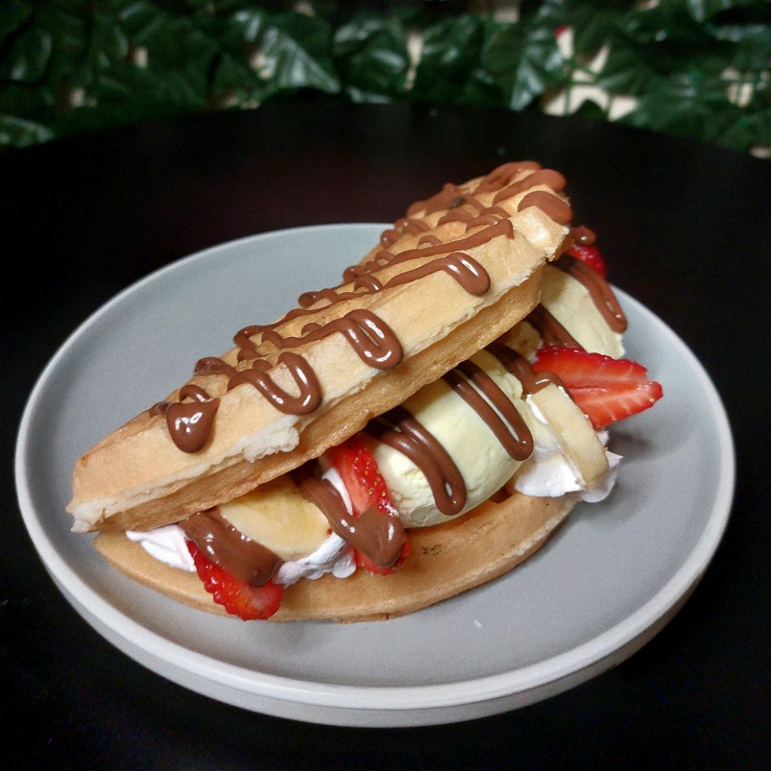 Fresas, bananos, helado, crema chantilly y Nutella.