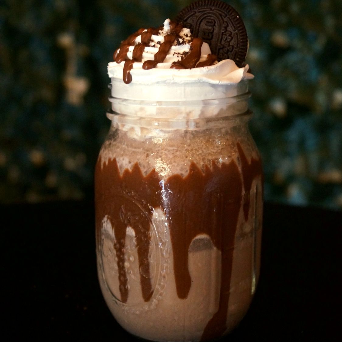Café, leche, hielo frappé, chantilly y Nutella y oreo.