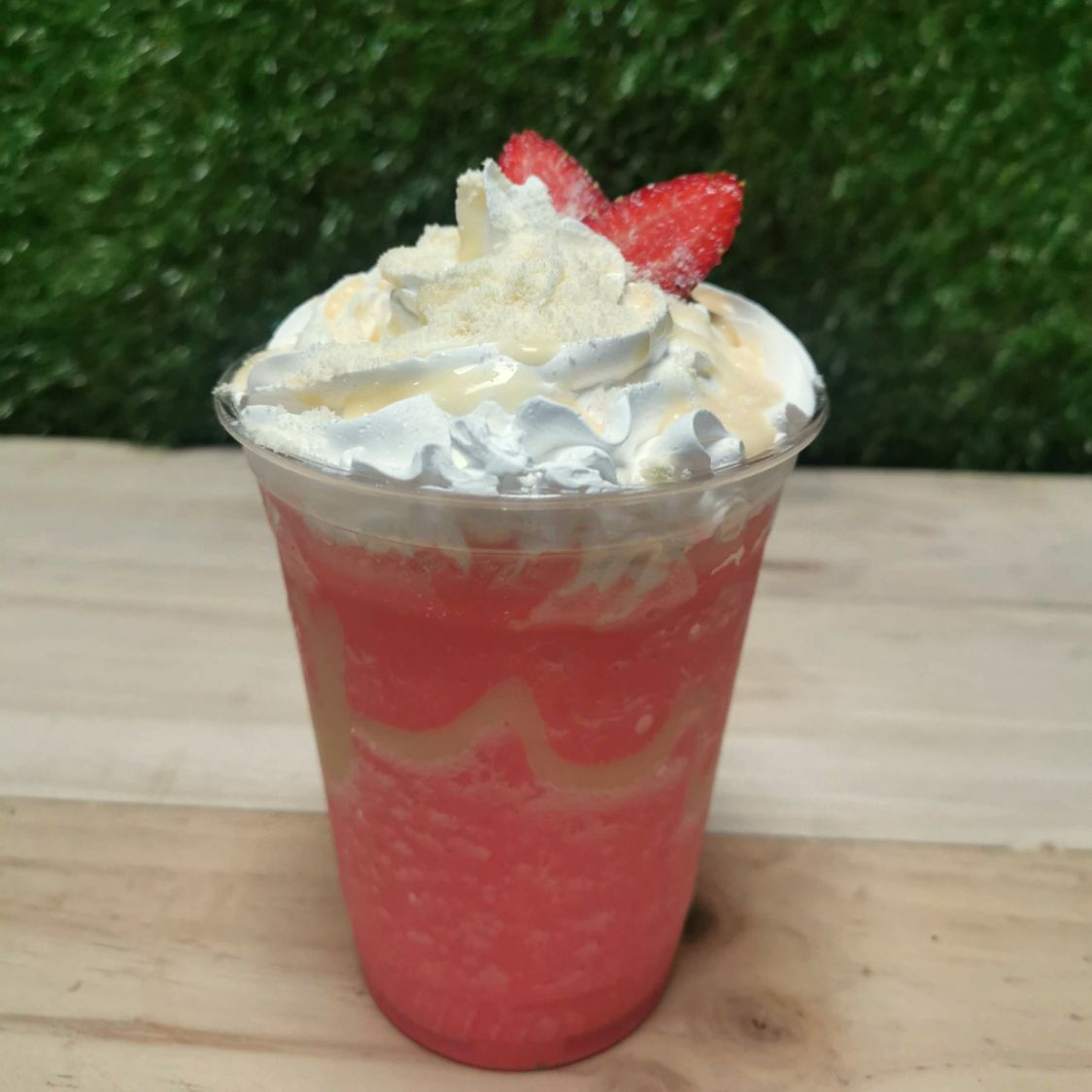 Fresas, leche condensada, leche pinito y crema chantilly sabor kola.