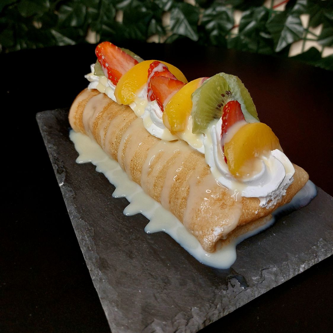 Melocotones , fresas , kiwi , crema chantilly y leche condensada