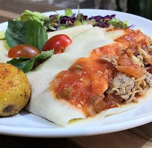 Carne mechada en salsa de tomate, aderezada con aguacate y papas pequeñas achiotadas.