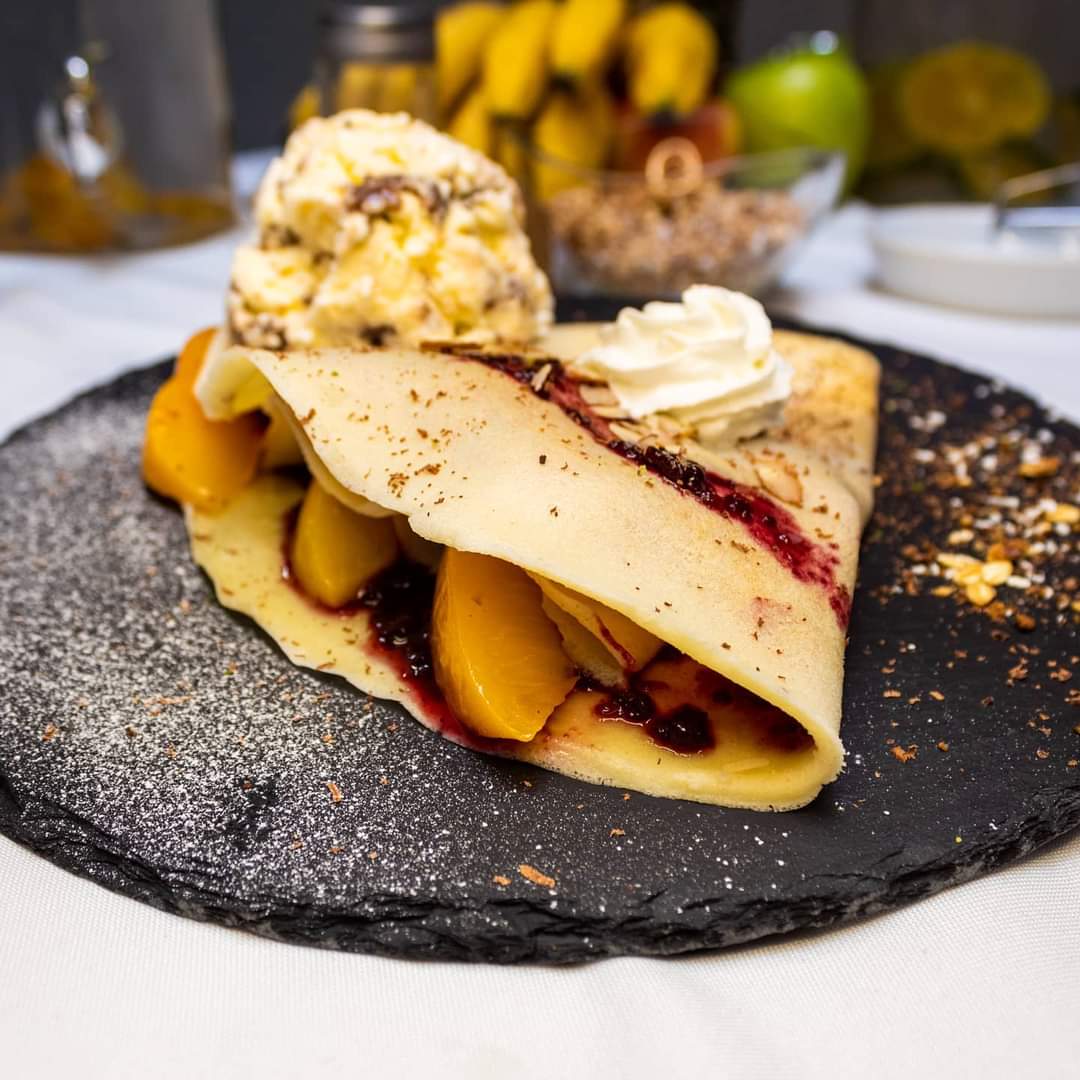Melocotón, mermelada de mora y albahaca, almendras fileteadas y helado.