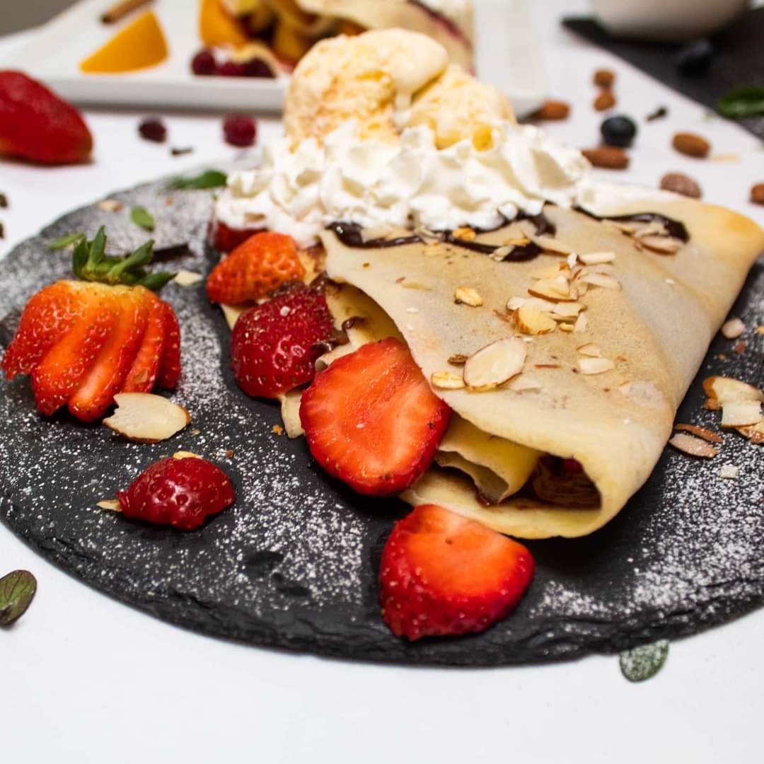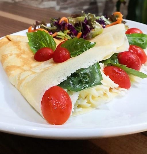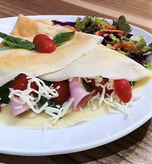 Jamón, queso mozarella, albahaca y tomate, acompañada de ensalada verde.