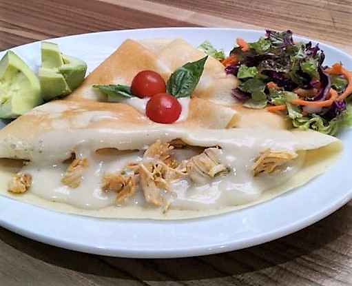 Pollo con salsa bechamel, albahaca, aguacate y tomate cherry.