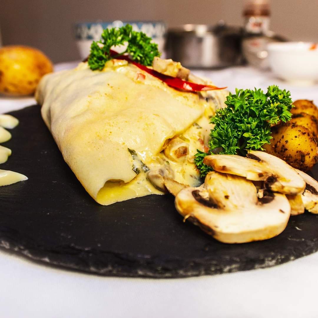 Pollo con hongos, acompañada con papas pequeñas achiotadas.