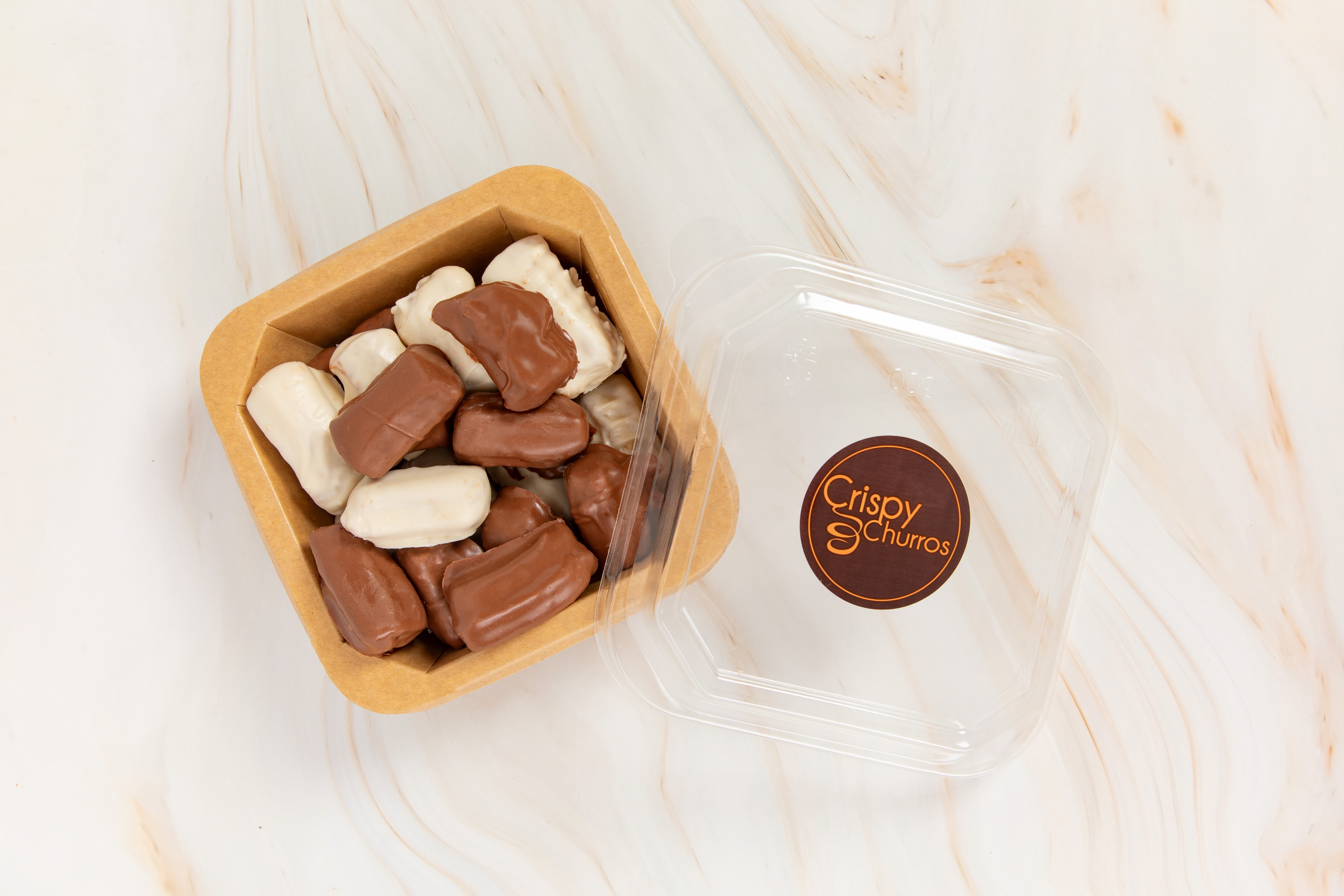 22 churro poppers cubiertos con chocolate y chocolate blanco