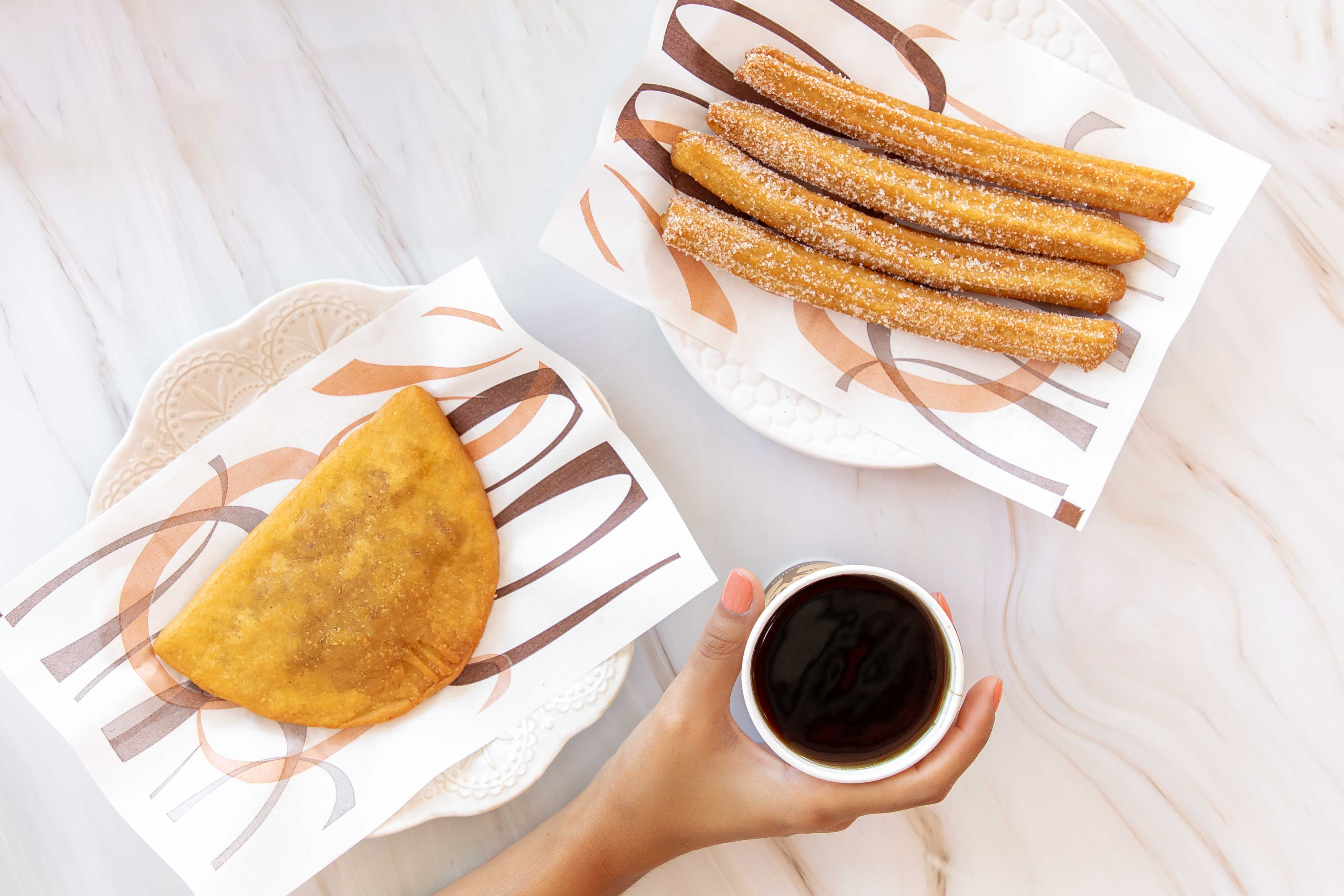 1 Empanada, 1 café, 1 orden de churros.