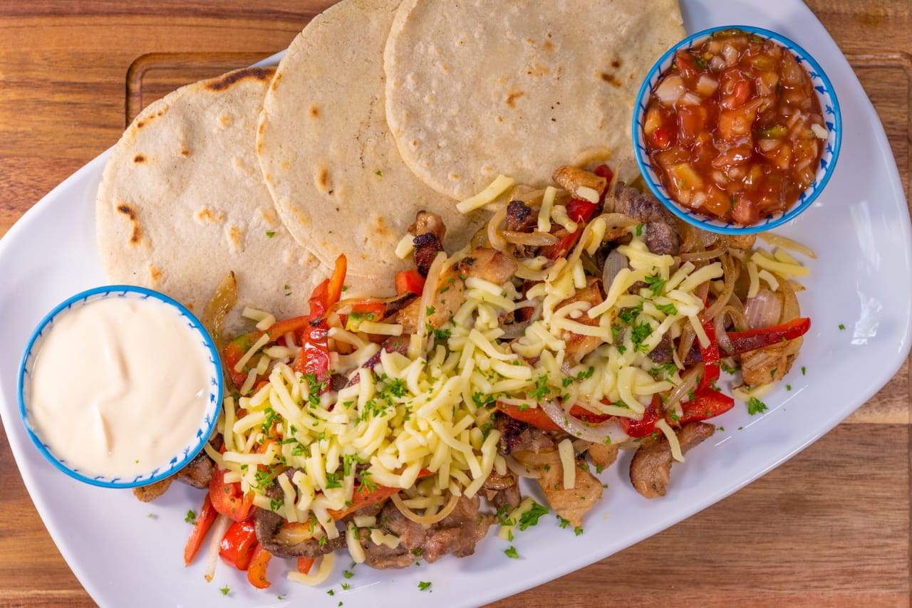 ¡La fiesta de las fajitas! 🎉 Pollo 🐔, res 🥩 y cerdo 🐖, salteados con cebolla y chile dulce 🫑. Servido con tortillas calientes. ¡Prepara tus tacos!