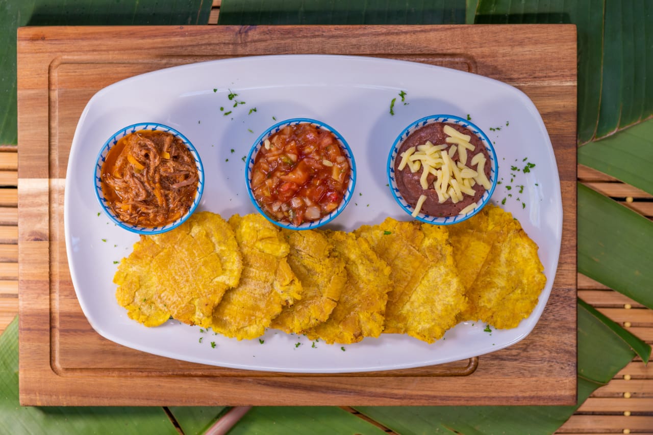 ¡El toque caribeño que te encanta! 🌴 4 crujientes patacones 🍌 acompañados de pico de gallo 🍅, carne mechada 🥩 y frijoles molidos. ¡Una delicia!