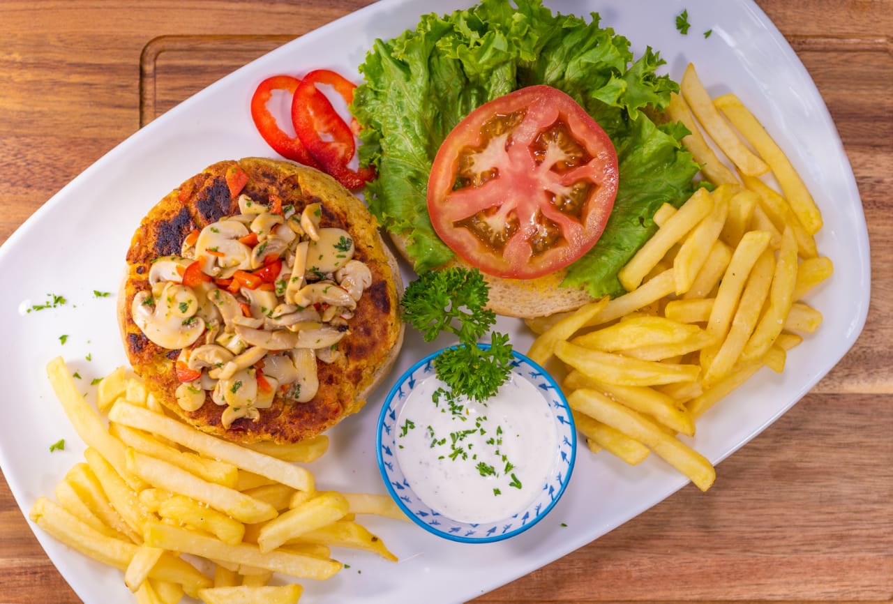 ¡La hamburguesa con un toque especial! 🐊 Carne casera 🍔, queso americano 🧀, jamón 🥓, lechuga 🥬 y salsas, acompañada de papas 🍟. ¡Una explosión de sabor!