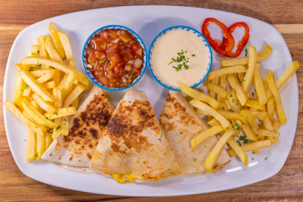 ¡La quesadilla que te hará feliz! 🌮 Tortilla de harina con pollo 🐔, queso mozzarella 🧀 y queso americano. Acompañado de natilla 🍦 y pico de gallo 🍅. ¡Un clásico delicioso!