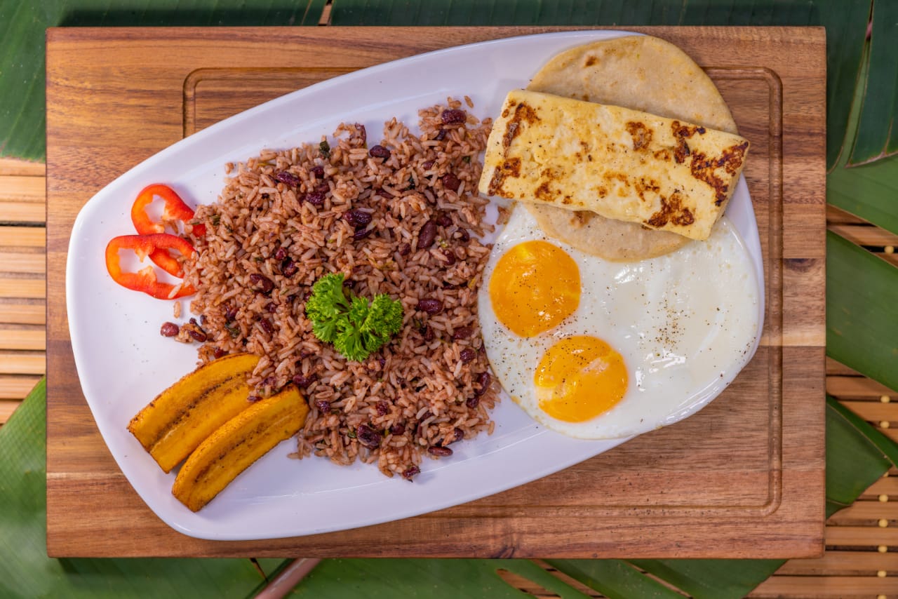 ¡El desayuno de campeones! 🍳🥓 Orden de gallo pinto 🍚, dos huevos, 2 maduros y queso a la plancha 🧀. Incluye tortilla y bebida a elección (café ☕ o jugo de naranja 🍊).
