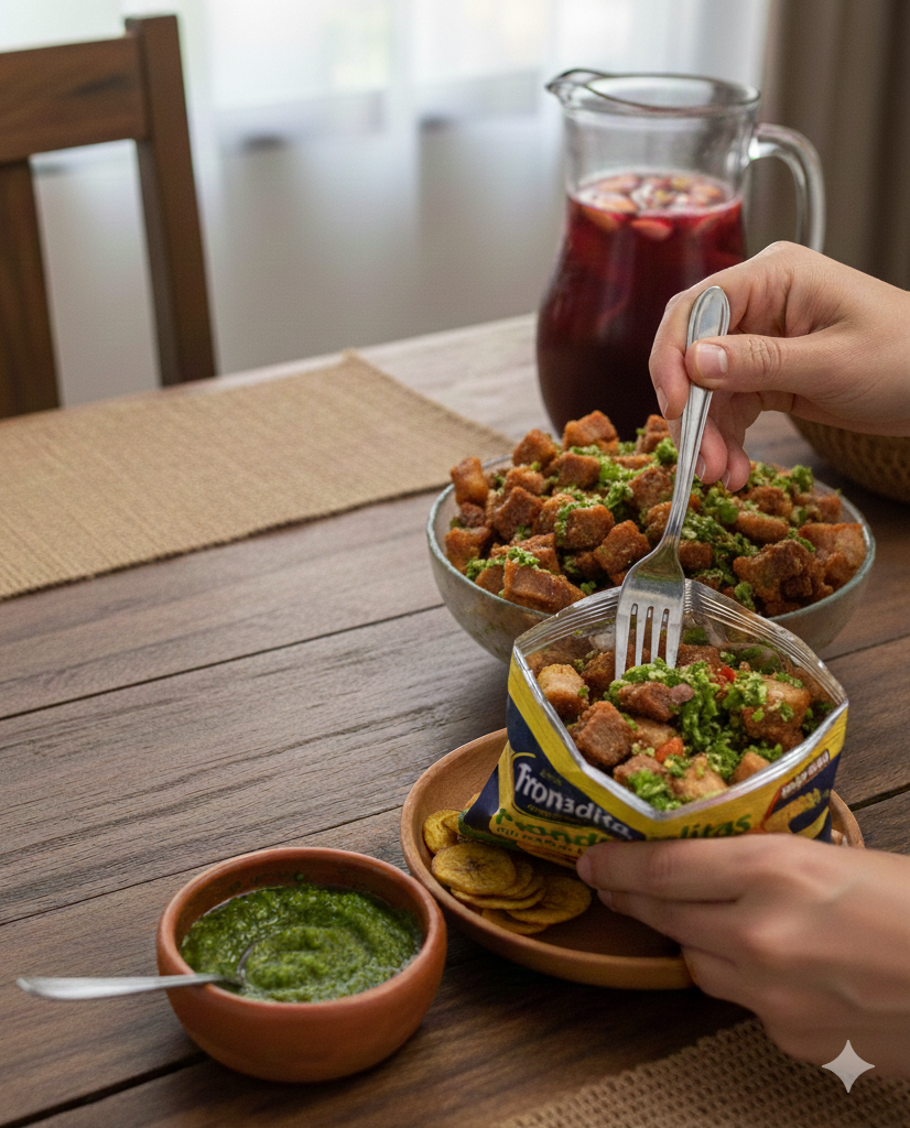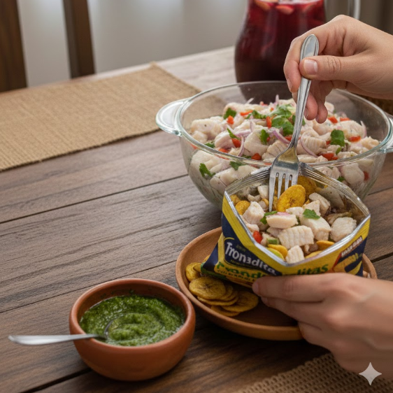 Deliciosa caldosa, ceviche de curvina y camarones, chimichurri y tronaditas.