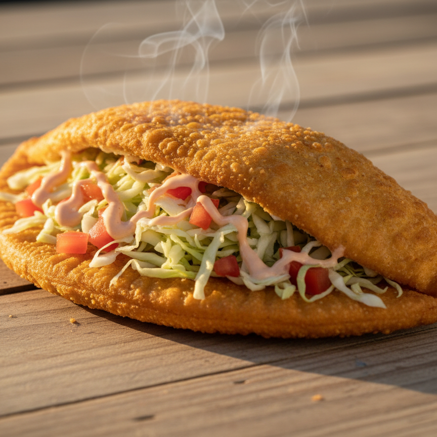 **Empanada Arreglada Tradicional** Disfrutá de nuestra empanada de maíz bien crujiente, abierta y rellena con fresca ensalada de repollo, chimichurri y el toque perfecto de nuestras salsas de la casa. ¡El sabor auténtico de Costa Rica en cada bocado!