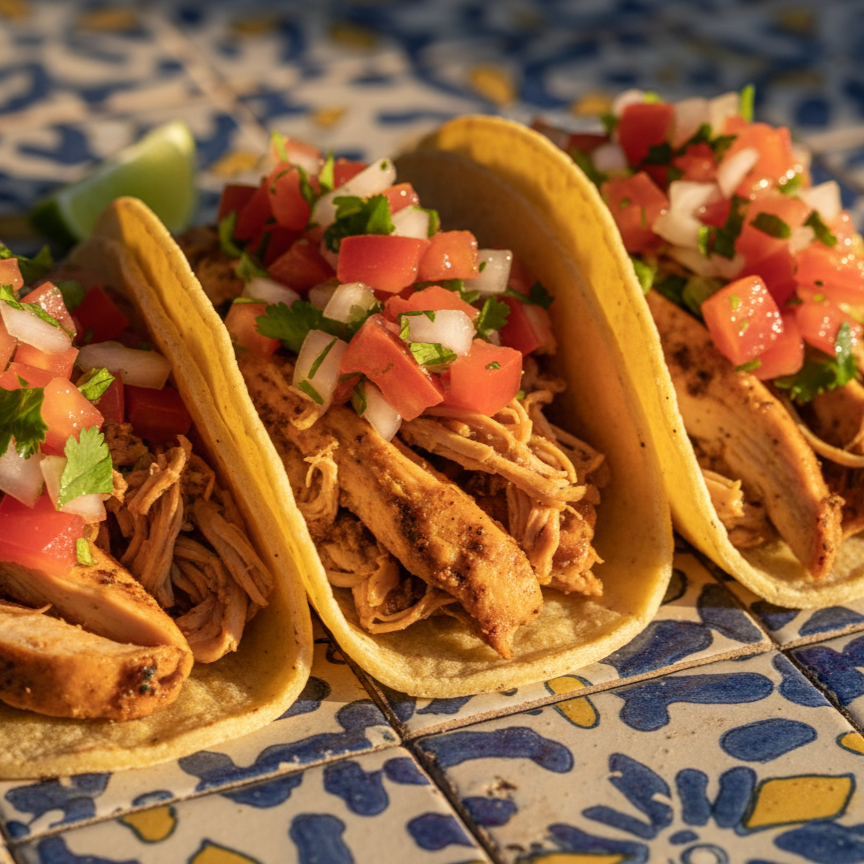 🌮 Tres deliciosos tacos de pollo desmechado premium, servidos en tortillas de maíz calientes y coronados con nuestro pico de gallo fresco y cítrico. ¡La combinación perfecta de frescura y sabor tradicional! ✨