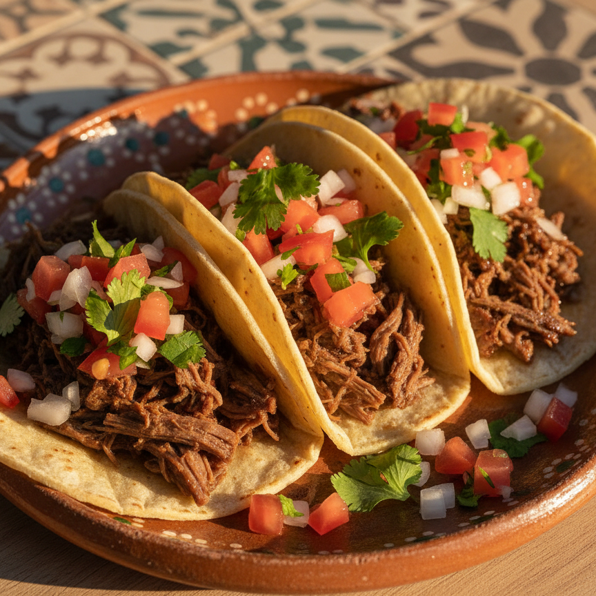 **Tacos de Carne con Pico de Gallo** Tres deliciosos tacos de carne premium finamente picada, servidos sobre tortillas de maíz calientes y coronados con un refrescante pico de gallo. ¡Un clásico lleno de sabor! 🌮✨