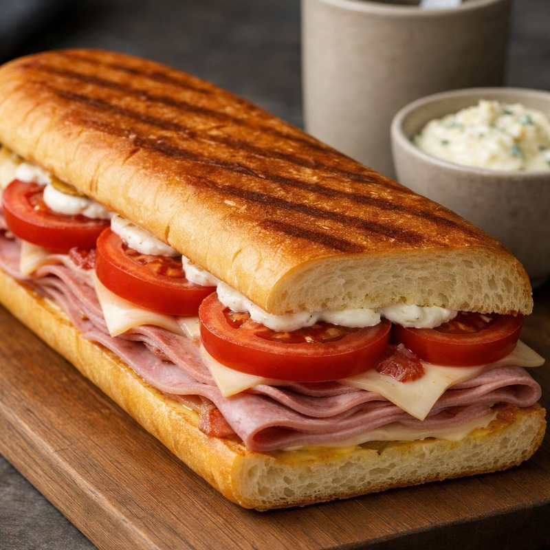Pan Baguette, Jamón, Queso, Tomate y Salsas de la Casa.