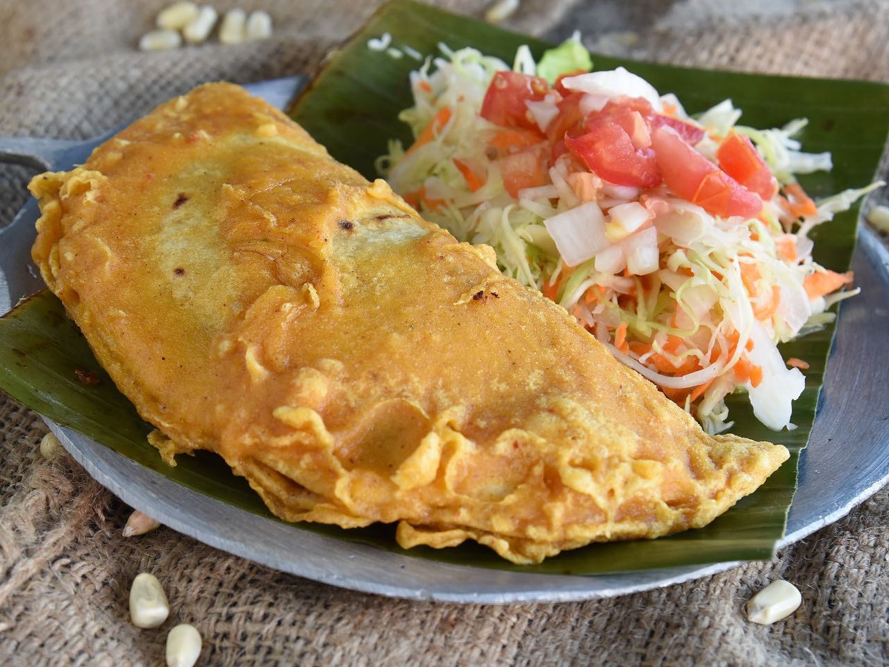 Tortilla de maíz palmeada, acompañamiento a elegir y ensalada de repollo.