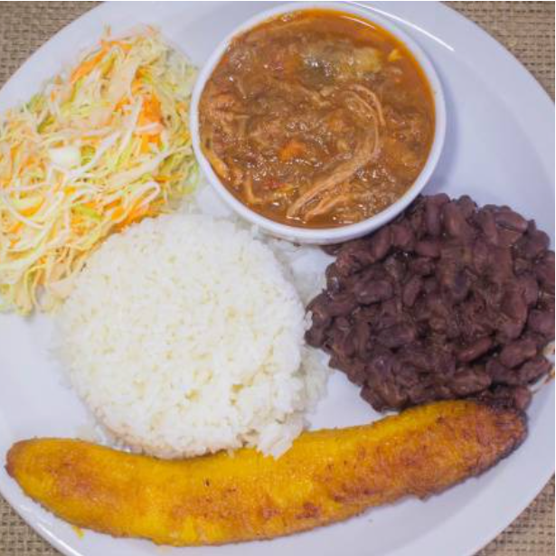 Carne desmenuzada, arroz, frijoles rojos enteros, ensalada de repollo y maduro frito.