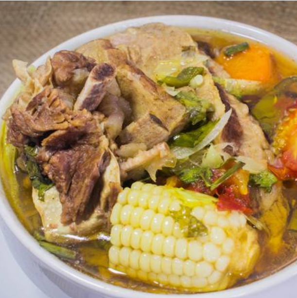 Sopa de costilla de res, yuca, plátano verde, ayote tierno, chayote, elote. Incluye arroz o tortilla de maíz.