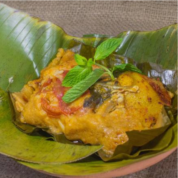 Masa de maíz preparada con papa, hierbabuena, tomate, cerdo y tocino envuelto en una hoja de plátano cocido al vapor.