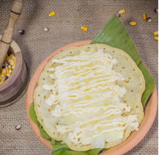 Tortilla de maiz palmeada rellena de pasta de quesillo con crema y encurtido de cebolla..