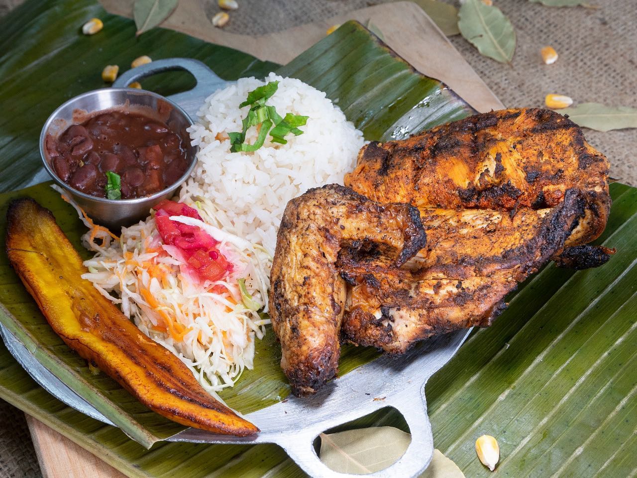 Proteína asada de su elección, arroz, frijoles, ensalada de repollo con zanahoria, maduro frito.