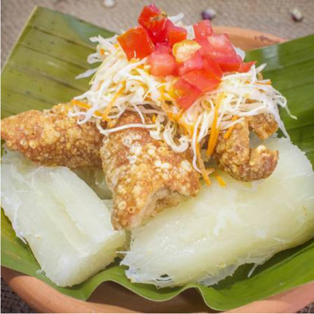 Una cama de yuca hervida con chicharrón de concha tostado y cerdo mixto, acompañado de ensalada de repollo.