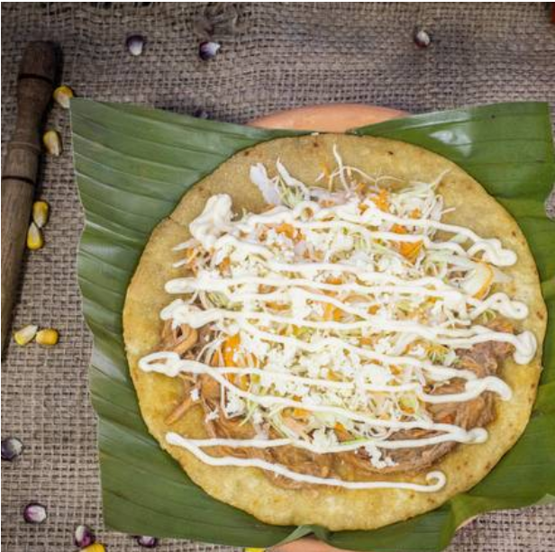 Tortilla frita, carne desmenuzada en salsa, ensalada de repollo, natilla, queso rallado.
