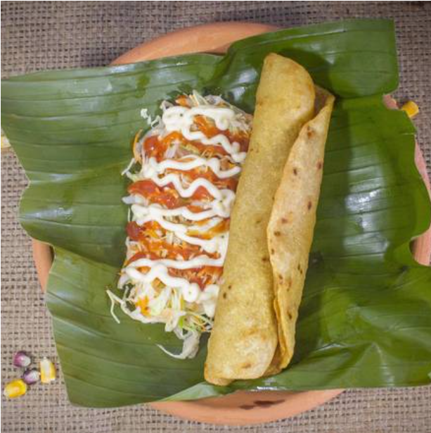 Tortilla de maíz, carne desmenuzada, acompañada con ensalada de repollo, salsa de tomate y crema. Ensalada de repollo, tomate, limón con cilantro.