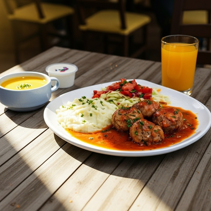 Combo con plato de albóndigas en salsa roja acompañado de puré y ensalada. Incluye entrada de Crema de Ayote, postre del día y bebida del día.