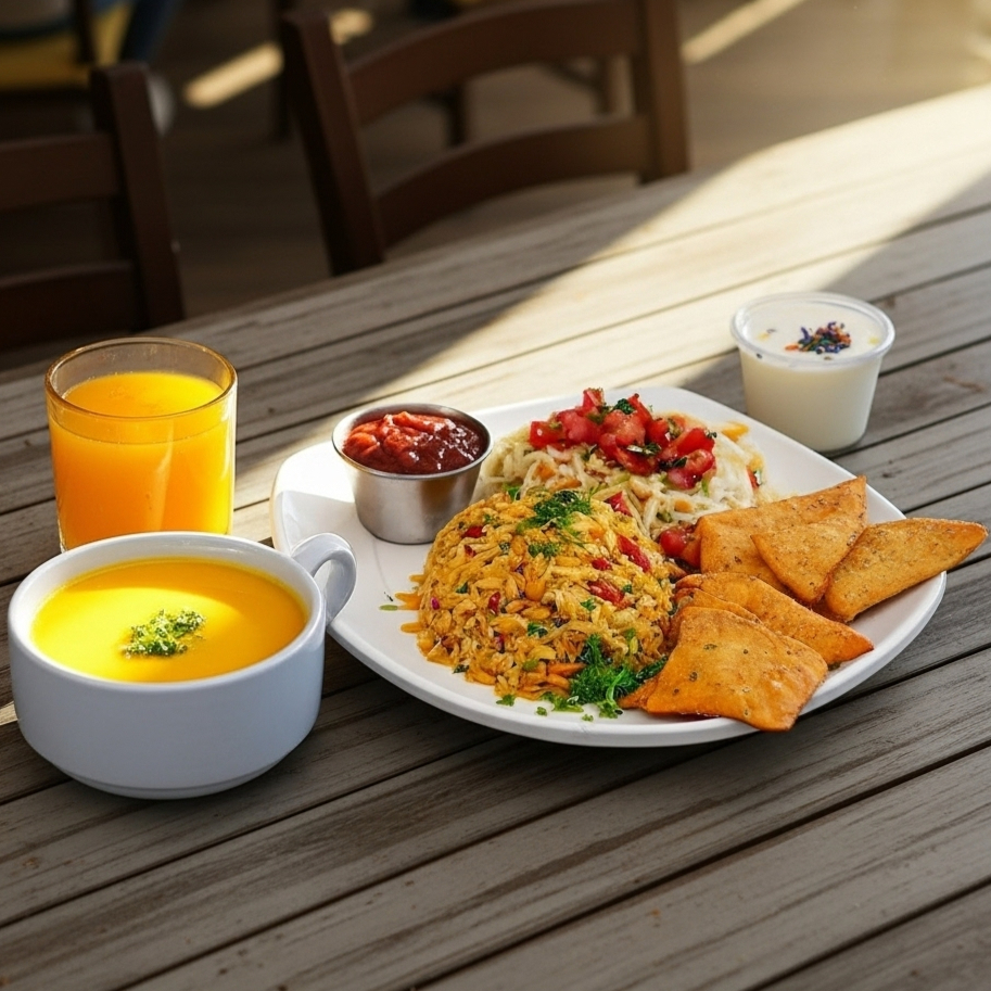 Combo con porción de arroz con pollo acompañado de una entrada de crema de ayote, tajadas y frijoles molidos. Incluye bebida y postre del día