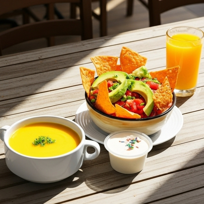 Chifrijo acompañado de bebida y refresco del día con entrada de crema de ayote.
