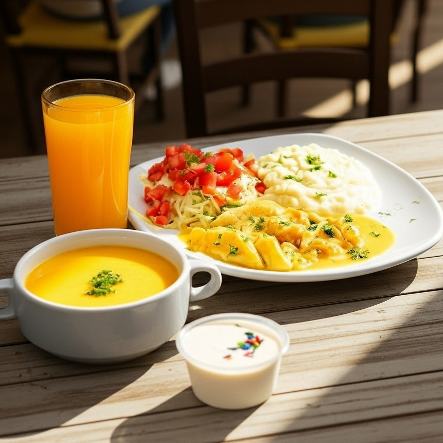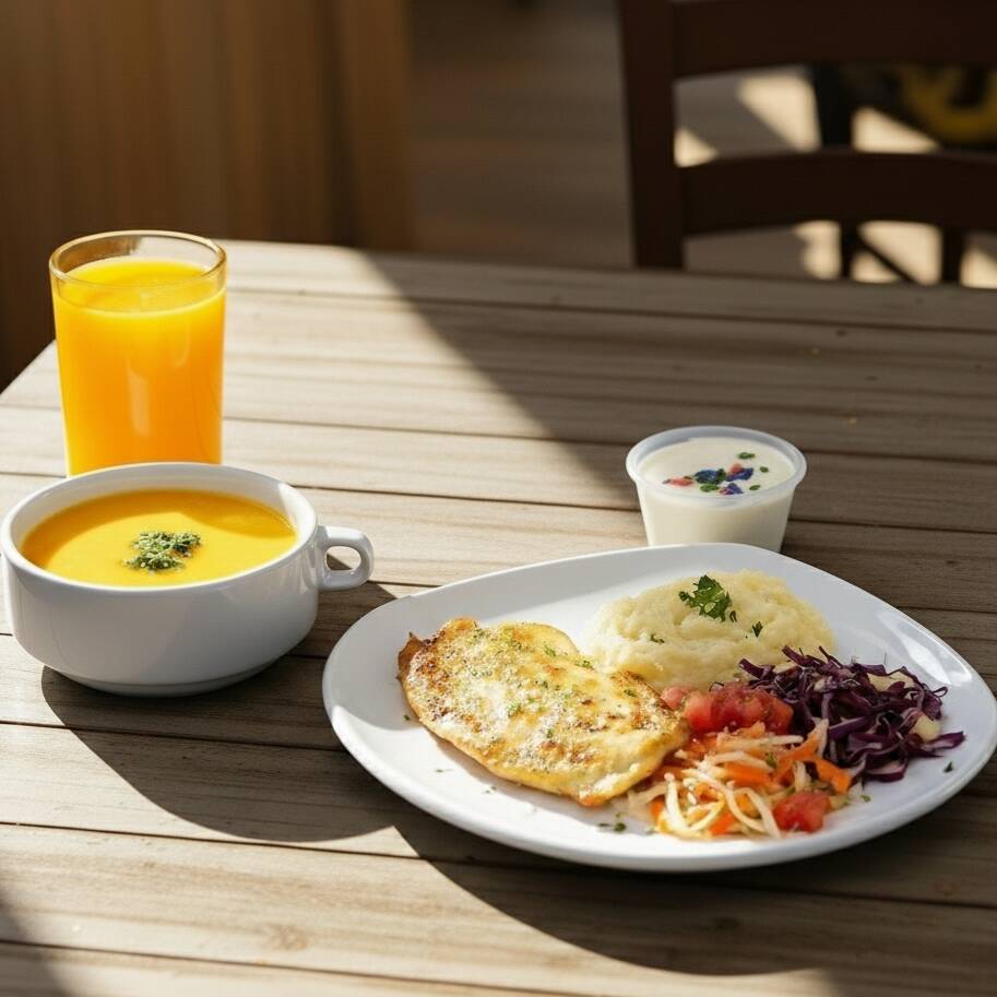 Pollo en salsa a la naranja acompañado con puré y ensalada. Incluye entrada de crema de ayote con postre y bebida del día.