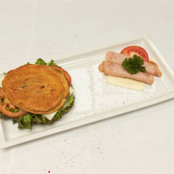 Delicioso y fresco pan de hojaldre relleno de frijoles molidos, lechuga, tomate, jamón y queso.