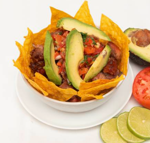 Deliciosos nachos de carne o pollo, acompañados de frijoles molidos, queso, aguacate, salsas y tomate.