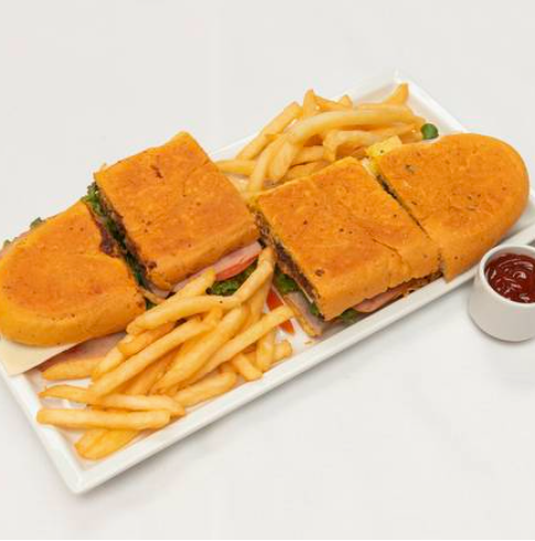 Delicioso sándwich premium, acompañado de pollo desmenuzado, carne, jamón, queso mozzarella, tomate, frijoles molidos y salsas, acompañado de papas fritas.(Aprox. 1 kg )